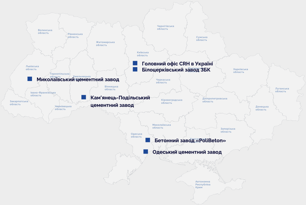 Компанія CRH (NYSE: CRH, LSE: CRH) - провідний постачальник будівельних матеріалів, який будує, об’єднує та покращує наш світ. Нараховуючи близько 78 500 працівників на 4 000 підприємствах у 28 країнах світу, CRH є лідером на ринку у Північній Америці та Європі. Будучи важливим партнером у проектах транспортної та критично важливої комунальної інфраструктури, комплексного нежитлового будівництва та рішень для життя, CRH пропонує унікальні матеріали, продукти та послуги з доданою вартістю, які допомагають створити більш стійке та екологічно безпечне будівельне середовище. Компанія входить до числа лідерів галузі за рейтингами екологічних, соціальних та управлінських (ESG) рейтингових агентств. Акції CRH входять до списку Fortune 500 та котируються на Нью-Йоркській та Лондонській фондовій біржах. Для отримання додаткової інформації відвідайте: www.crh.com Про CRH в Україні У 1999 році компанія CRH вийшла на ринок України, придбавши Кам’янець-Подільський цементний завод у Хмельницькій області. Ми модернізували завод, інвестувавши понад 300 млн євро і перейшли на сучасний та екологічний сухий спосіб виробництва цементу. Сьогодні Група CRH представлена в Україні компанією CEMARK та об'єднує Миколаївцемент, Кам'янець-Подільський та Одеський цементні заводи, Комплекс для відвантаження цементу у м.Вишневе, Київської обл. Окремими напрямками бізнесу CRH в Україні — виробництво бетону та залізобетонних виробів. Білоцерківський завод ЗБК "PoliBeton Energo» - є спеціалізованим підприємством, яке виробляє опори для ліній електропередачі. ASTOR – мережа бетонних заводів у Києві, Київській обл. та Одесі.