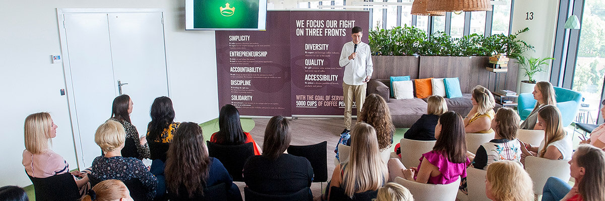 Ми спілкуємось у міжнародному середовищі. JDE заохочує ініціативність і внутрішню мобільність між різними функціями та офісами компанії.